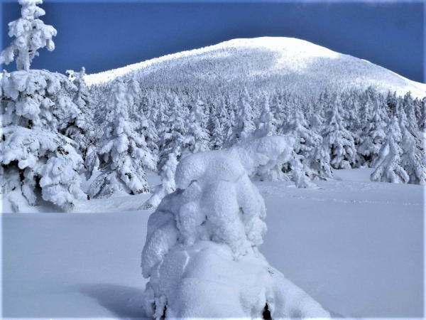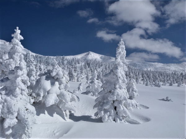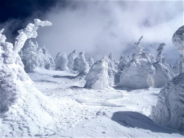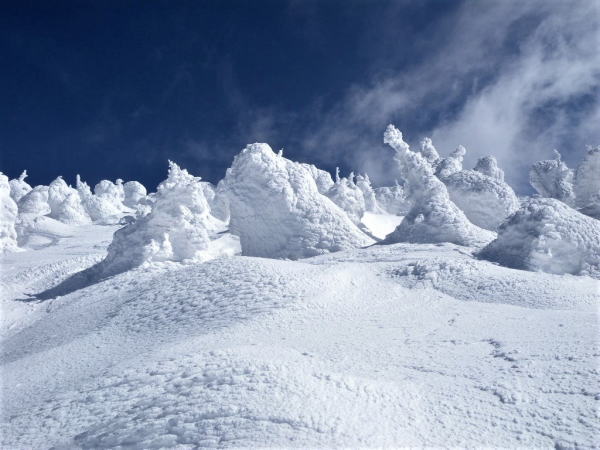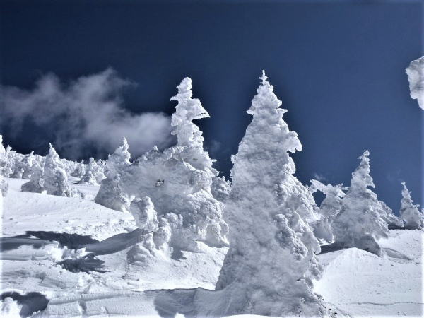 蔵王山の標高1450m~1650m付近にアオモリトドマツ樹林帯があると思われます。アオモリトドマツに過冷却水滴が枝や葉にぶつかり凍りつき風上に向かって成長(エビのしっぽ)します。エビのしっぽがアオモリトドマツ全体を覆うと樹氷と呼ばれています。葉の無いアオモリトドマツは何とも言いようがありません。アオモリトドマツ再生を願う。