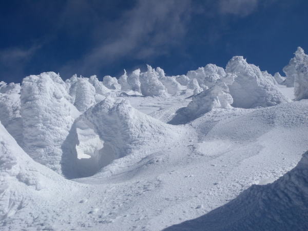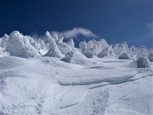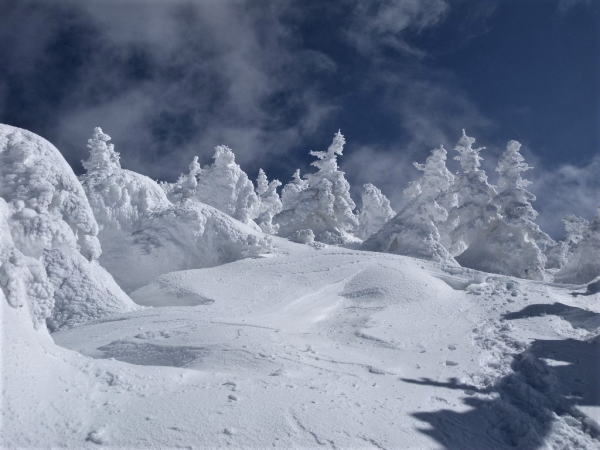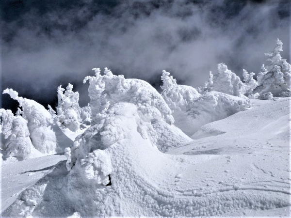 樹氷に風が当たり雪を抉る